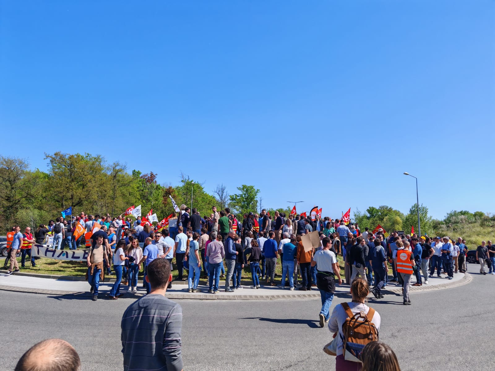 1 500 travailleurs de différentes entreprises de l’aéronautique et de la défense, donneurs d’ordre et sous-traitance, manifestaient jeudi 10 avril à Mérignac près de Bordeaux pour des augmentations de salaire. Arianegroup, Dassault, Airbus, Safran, CGI et Akkodis étaient représentés.