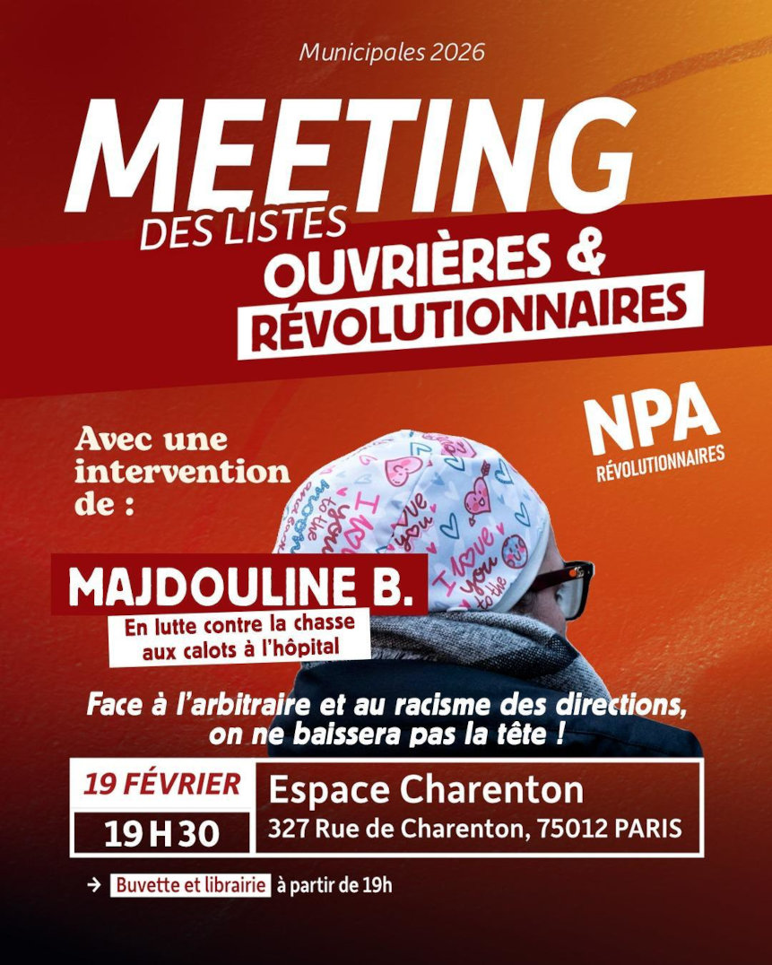 À l’hôpital, depuis que la décision validant la sanction de Majdouline est tombée, les collègues se passent le mot, expriment leur solidarité et leur exaspération face à cette direction qui n’a que sa croisade politique en tête, alors que les services se meurent du manque de personnel et de moyens, et ne tournent que par la bonne volonté de toutes celles et ceux qui soignent. De nombreux syndicalistes, militants, jeunes s’organisent pour rompre l’isolement et fédérer la lutte. Alors le combat continue, et pour en parler elle-même, pour la première fois en public, Majdouline interviendra au meeting de campagne du NPA-R, qui aura lieu jeudi 19 février (à l’espace Charenton, à 19 heures) pour la liste « Paris ouvrière et révolutionnaire » menée par Blandine Chauvel, pour les élections municipales de mars prochain.