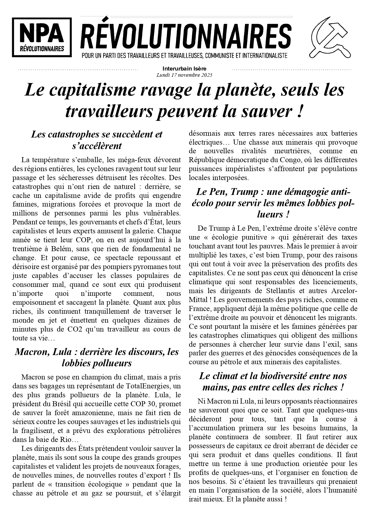 Le journal du NPA Révolutionnaires