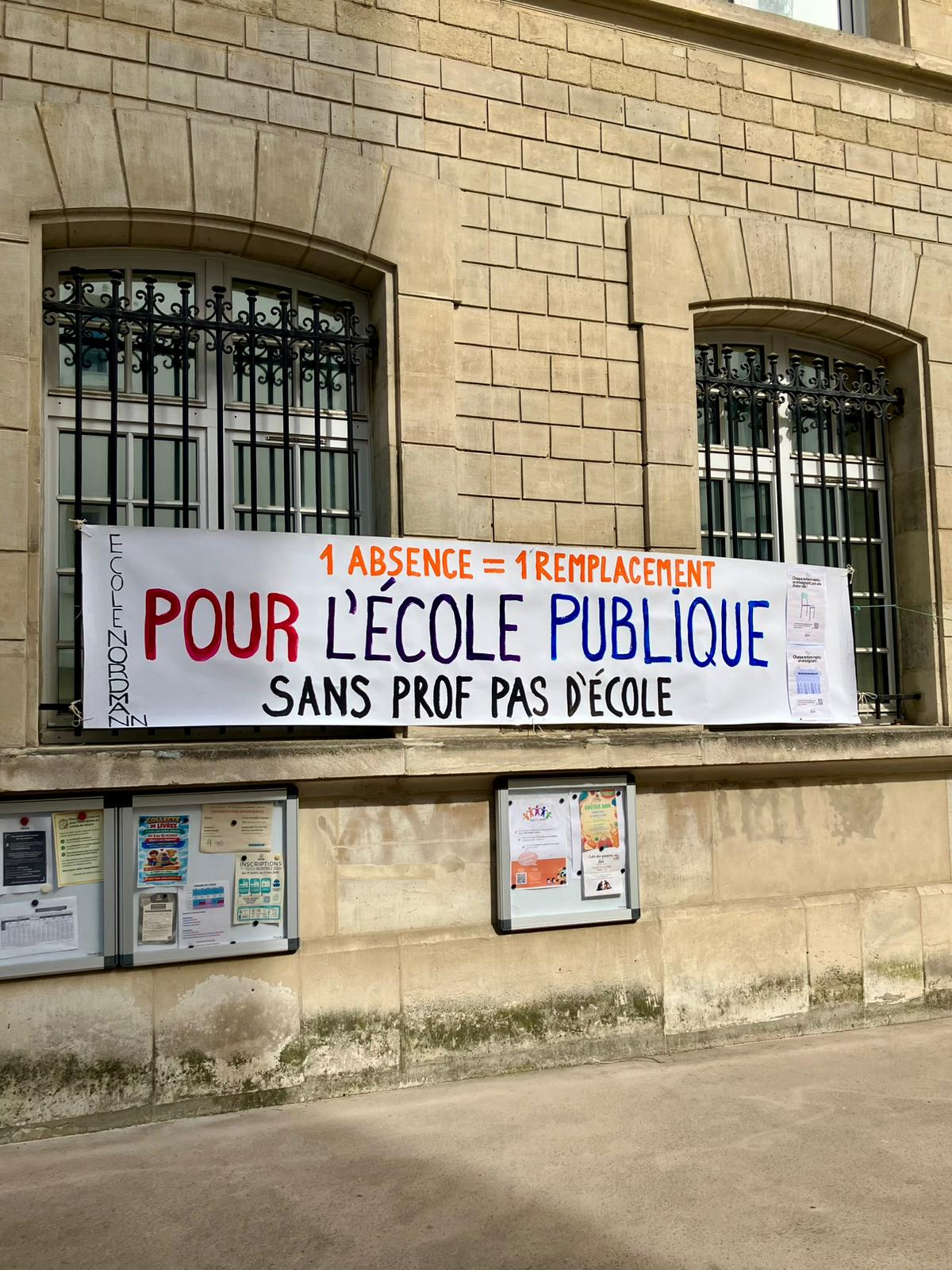 Cette situation est loin d’être une exception : il suffit de lire les banderoles devant les établissements de Paris, du 93, de Marseille et d’ailleurs. Dans toutes les académies, on manque de remplaçants, les collègues se disent impuissants et se sentent épuisés, voire contraints de démissionner, « broyés par ce système » qui précarise et maltraite le personnel d’éducation (AESH, Atsem, ATE, PE, animateurs) au même titre que les élèves eux-mêmes. C’est tout un système qui organise cette précarité en supprimant les postes, surchargeant les classes et préférant investir dans l’armée plutôt que dans les écoles, les hôpitaux… Dans tous les préaux où il n’a pas été retiré, le président de la République française veille depuis son cadre sur la destruction orchestrée de l’éducation. Seules nos luttes communes entre élèves ou parents d’élèves et tous les travailleurs et travailleuses de l’éducation pourront mettre un terme à cet engrenage.