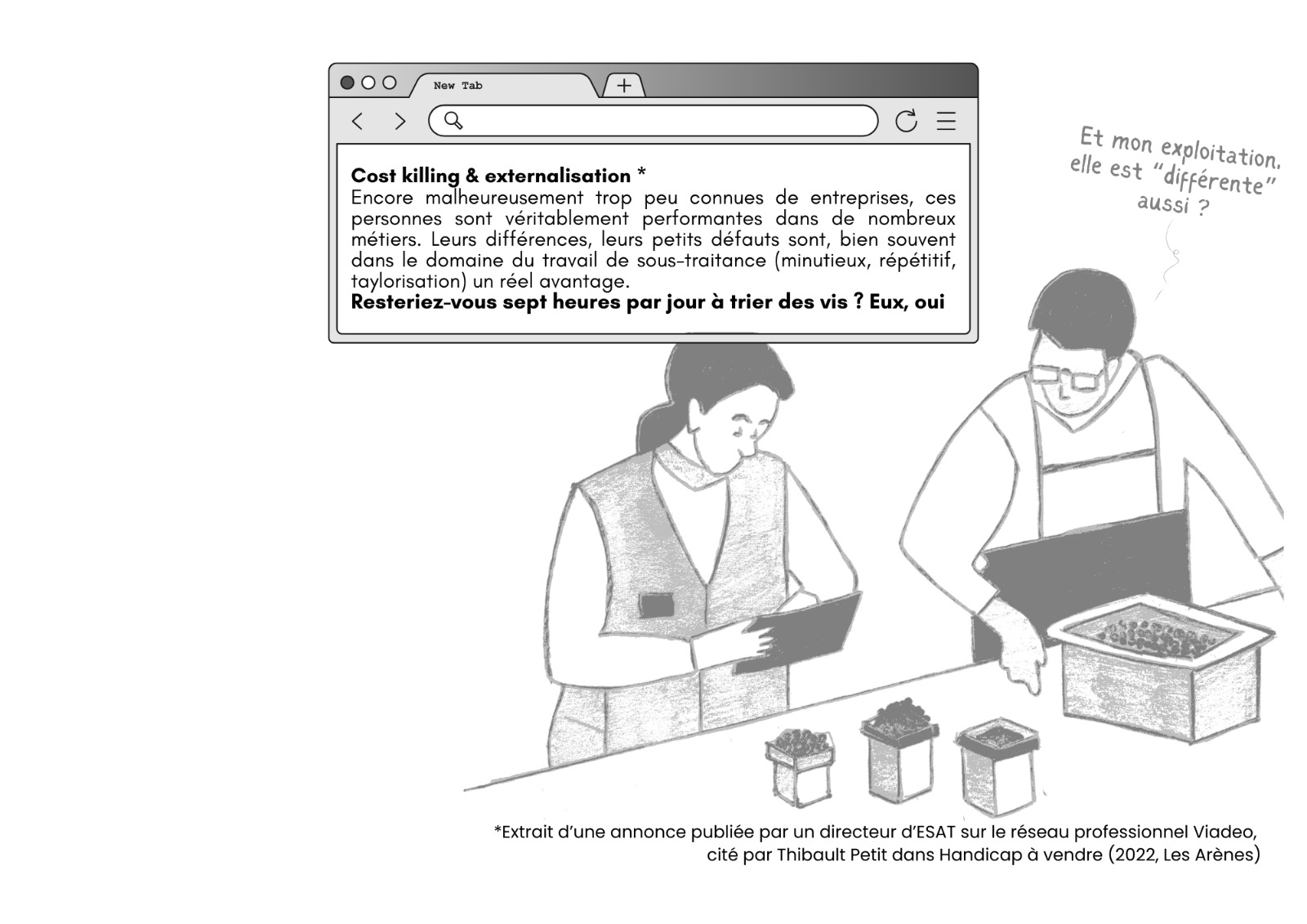 Percevoir un salaire… c’est bien l’un des problèmes dans ces Esat. Celles et ceux qui y travaillent jusqu’à 35 heures par semaine ne sont pas salariés mais « usagers » de ces centres médico-sociaux qui dépendent du Code de l’action sociale et des familles, et non du code du travail. Ils ne perçoivent donc pas un salaire, mais une « rémunération garantie », comprise pour quelqu’un qui travaille à plein temps entre 55 % et 110 % du Smic. Une rémunération dérisoire, qui peut se cumuler avec l’allocation aux adultes handicapés (AAH) à condition… de ne pas dépasser le Smic.