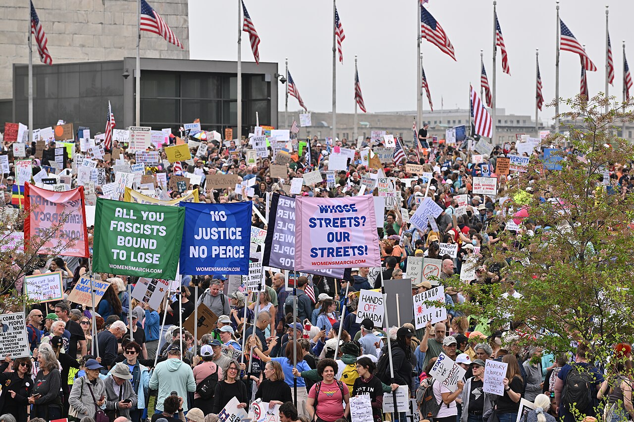 Sous une pluie froide, à New York, 100 000 personnes ont défilé dans Manhattan, le long de la 5e Avenue, dans un cortège bruyant, enthousiaste et énergique. Le National Mall à Washington a également accueilli un rassemblement d’environ 100 000 personnes. Parmi les manifestants, de nombreux travailleurs du public (fédéraux, étatiques ou municipaux) et leurs syndicats, directement attaqués par Musk. En même temps à Washington, une autre manifestation, nettement plus marquée à gauche, était appelée par des organisations comme le Palestinian Youth Movement ou le Parti pour le socialisme et la libération (PSL). En défense des Palestiniens, elle a rassemblé au moins 40 000 personnes dont de nombreux groupes d’étudiants syndiqués ainsi que d’autres cherchant à créer un syndicat dans leur université, côte à côte de jeunes travailleurs de Amazon ou Google.