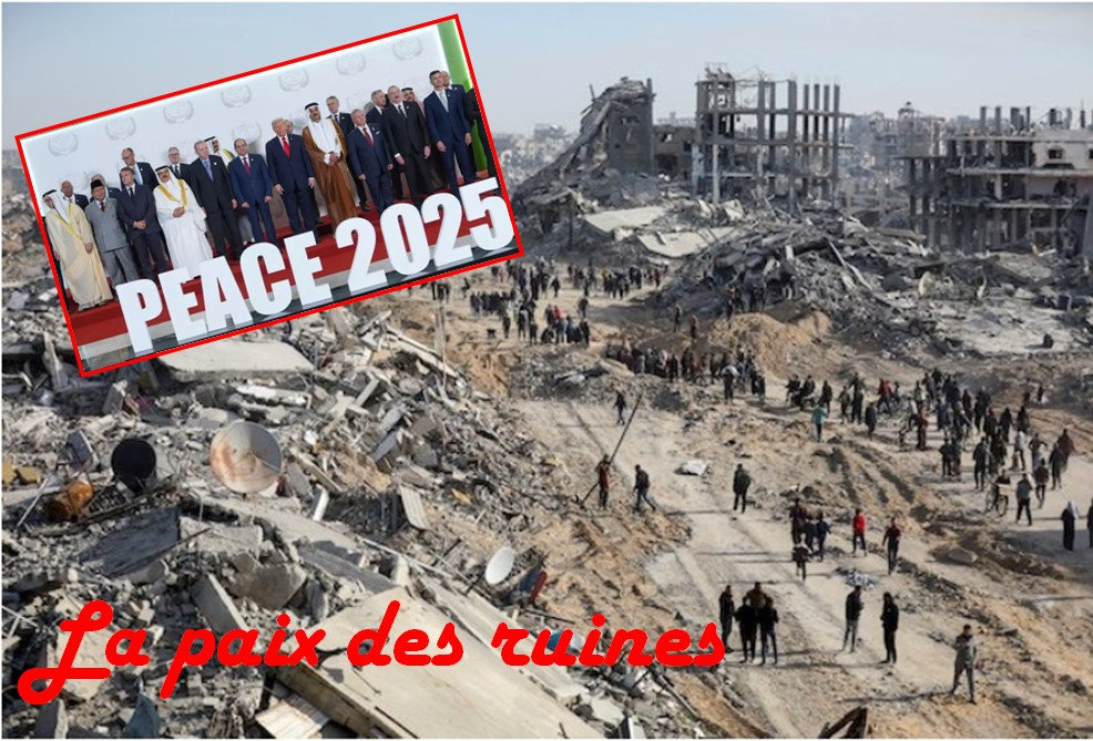 C’est à Charm el Cheikh en Égypte que se jouait ce même lundi 13 octobre, le deuxième show dudit « plan de paix ». Devant un aréopage d’une vingtaine de chefs d’État, dont le maréchal Sissi, le roi de Jordanie, le président turc Erdoğan, Emmanuel Macron, Trump qualifiait ce sommet de « jour formidable pour le Moyen-Orient ». Mahmoud Abbas, le président de l’autorité palestinienne n’était là qu’en figurant. Ni l’autorité palestinienne (il est vrai déconsidérée en Palestine pour son rôle de collaboration avec Israël) ni encore moins les Palestiniens eux-mêmes n’auront eu leur mot à dire sur la gestion de Gaza pour l’après-guerre.