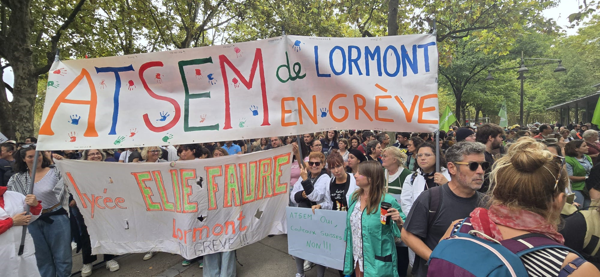 Nous avons fait trois semaines complètes de grève de la restauration scolaire, entre midi et 14 heures, à 37 sur 46 Atsem, puis des journées plus éparses. Nous sommes soutenues depuis le début par les syndicats CGT-territoriaux, Educ’Action et la FSU. Tous les midis, nous nous retrouvons pour pique-niquer et tenir notre assemblée devant la mairie de Lormont. Nous y avons confectionné notre banderole et nos pancartes pour participer aux manifestations des 10 et 18 septembre. Nous avons aussi le soutien de nombreux parents, enseignantes et enseignants.