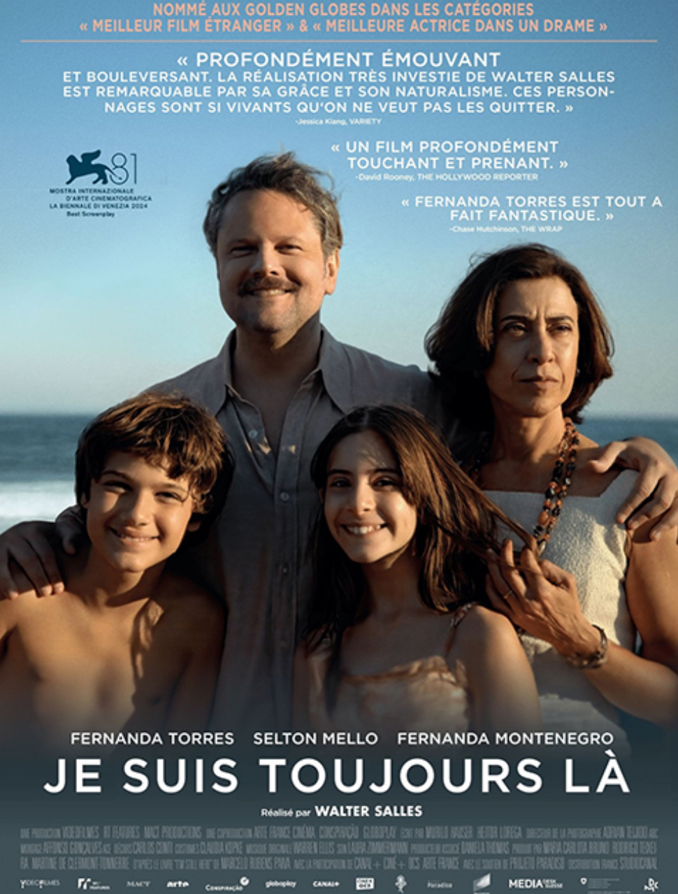 Le film, sorti en 2024, est basé sur une histoire vraie, celle de la disparition de Rubens Paiva durant la dictature militaire brésilienne en 1971. Paiva, député du Parti travailliste, est déchu de ses fonctions en 1964 lors de l’arrivée au pouvoir de la junte militaire et il est alors contraint à l’exil, séparé de sa famille. Quand il rentre au Brésil en 1966, il annonce officiellement renoncer à la politique pour se consacrer à ses travaux d’ingénieur et d’architecte. Les vingt-cinq premières minutes du film participent de ce faux-semblant. La vie de la famille est libre, douce et insouciante pour les cinq enfants de Rubens et de son épouse Eunice dans la grande maison bourgeoise qui donne sur la baie de Rio de Janeiro. Au retour de la plage, on y fait souvent la fête, la table est bien garnie, les amis sont nombreux, le contexte politique semble relégué aux informations à la télévision et à quelques coups de téléphone discrets. C’est une caméra Super 8, maniée avec impertinence par Veroca l’ainée des filles qui capte ces improbables moments de bonheur, qu’on pressent éphémères alors que des hélicoptères militaires survolent la plage après avoir largué en pleine mer les corps des opposants que le régime enlève avant de les torturer. Quand Paiva est brutalement enlevé chez lui par des sbires du régime, le film bascule. Rien ne sera plus comme avant. Eunice devient alors le personnage central du film. Elle-même enlevée et torturée pendant douze jours, Eunice est relâchée mais Rubens lui, ne rentrera jamais à la maison. S’il faut continuer à vivre, à sourire, il ne faut jamais renoncer une seule seconde à connaître la vérité sur la disparition de l’être aimé. Ce sera le combat du reste de la vie d’Eunice, aux côtés de ses enfants. C’est seulement en 1996 que l’État brésilien reconnaîtra officiellement la mort de son mari. Le corps de Rubens Paiva n’a jamais été retrouvé. Comme celui de centaines d’autres militants enlevés par les militaires qui quitteront le pouvoir en 1984 après avoir fait voter une loi d’amnistie exonérant de jugement tous les tortionnaires. Le film a rencontré un immense succès populaire au Brésil, avec plus de 3,5 millions de spectateurs, pour lesquels sans doute, ni l’oubli ni le pardon ne sont à l’ordre du jour. Depuis sa sortie en France le 15 janvier il cartonne aussi, n’hésitez pas à le découvrir rapidement !