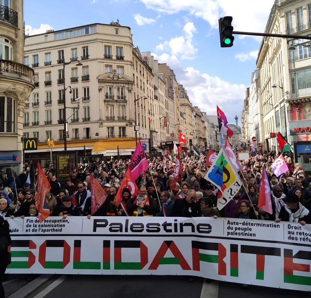 Depuis trois ans, les manifestations pour le peuple palestinien continuent toutes les semaines. Et pour cause, les massacres dans la bande de Gaza et la colonisation en Cisjordanie ne faiblissent pas. Au contraire, l’armée israélienne intervient une nouvelle fois au Liban et les États-Unis bombardent depuis un mois l’Iran. Tous les cortèges de la manifestation le rappelaient : États-Unis, hors du Moyen-Orient ! Mais c’est bien toutes les puissances impérialistes, dont la France, qu’il faut dégager !
