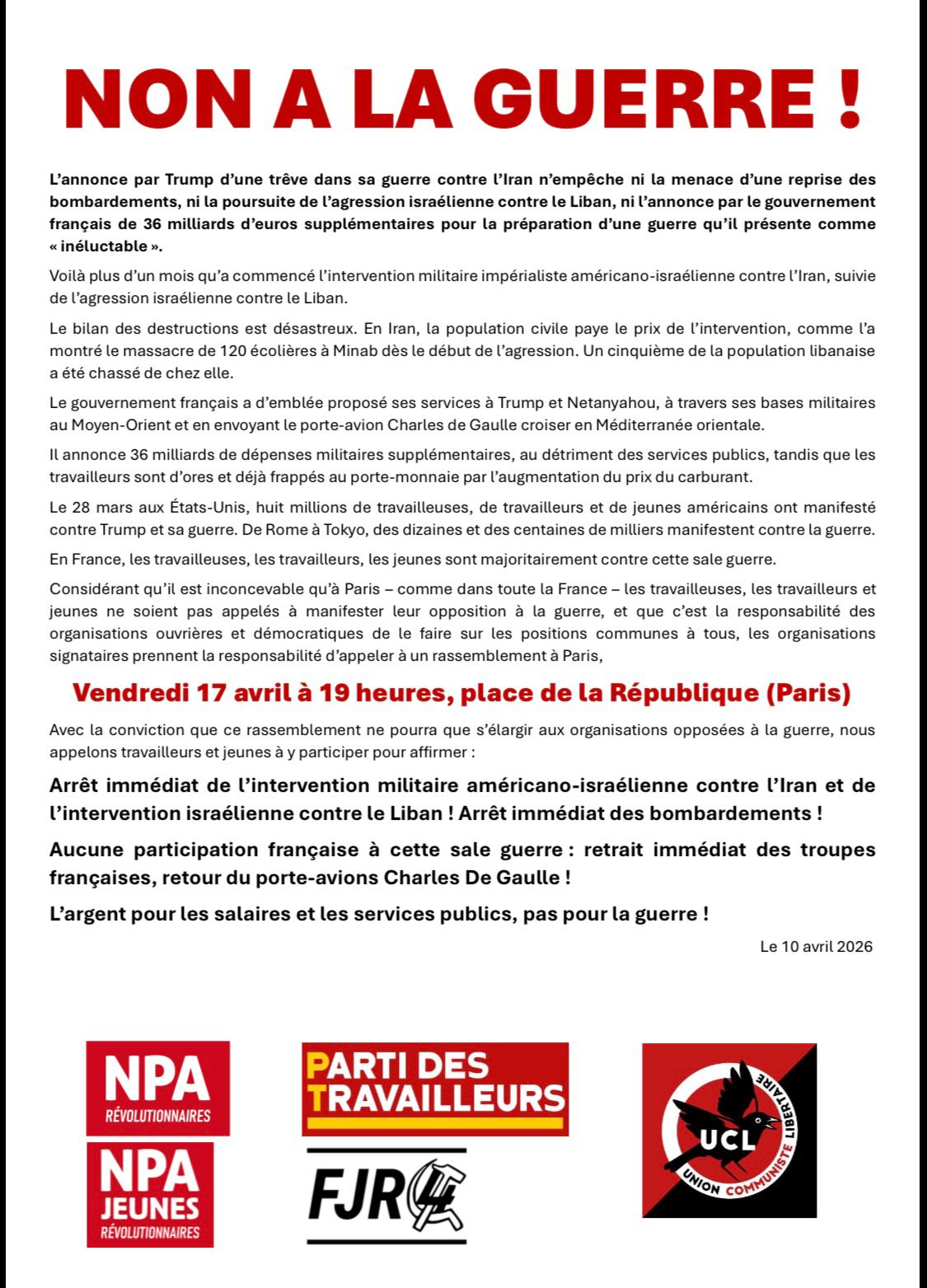 Considérant qu’il est inconcevable qu’à Paris – comme dans toute la France – les travailleuses, les travailleurs et jeunes ne soient pas appelés à manifester leur opposition à la guerre, et que c’est la responsabilité des organisations ouvrières et démocratiques de le faire sur les positions communes à tous, les organisations signataires prennent la responsabilité d’appeler à un rassemblement à Paris.