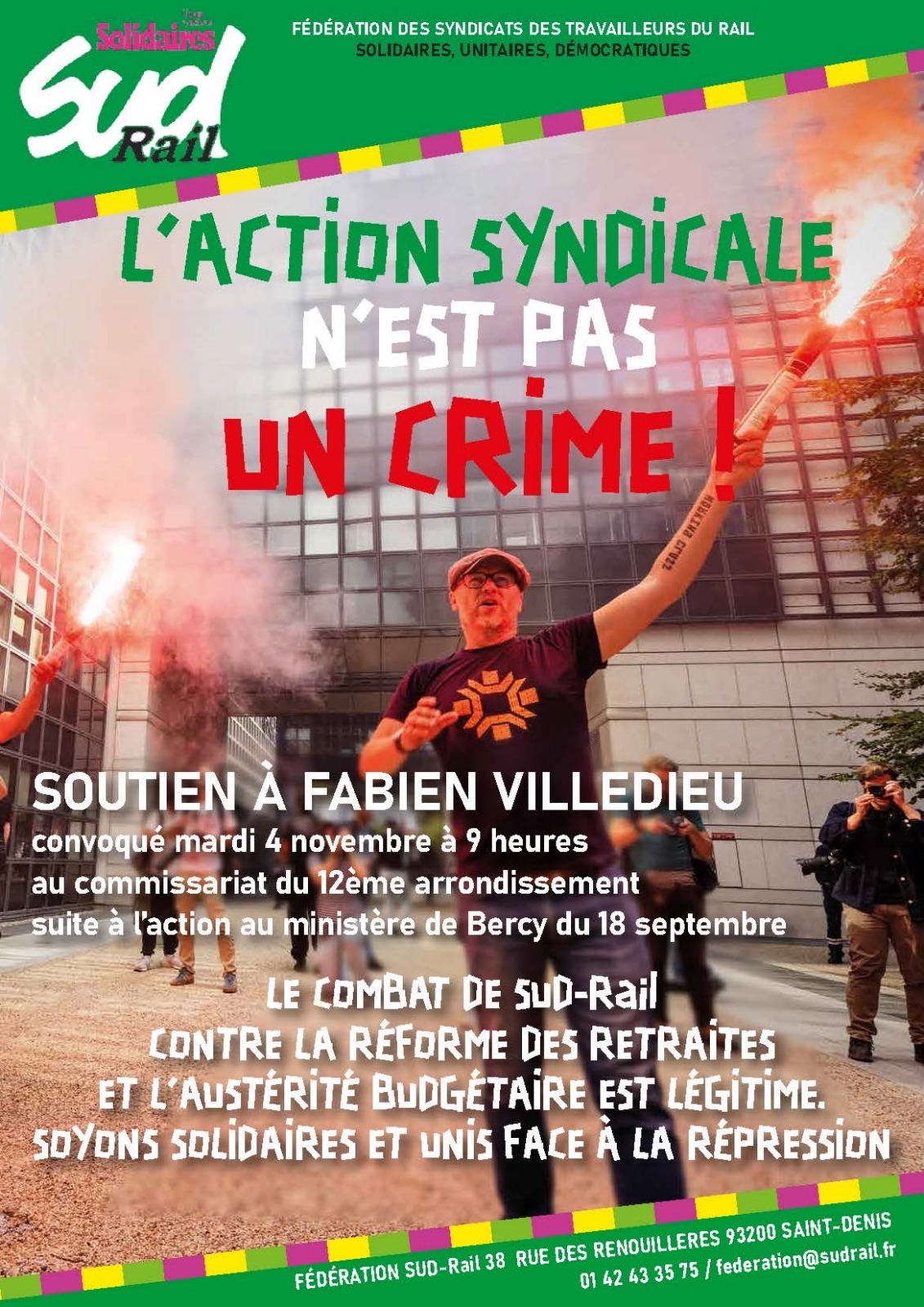 Gréviste, pas voyou ! Le secrétaire fédéral de Sud Rail, Fabien Villedieu, est convoqué par la police, après l’organisation d’une action syndicale symbolique au ministère de l’économie, le 18 septembre dernier, lors d’une journée de grève nationale d’ampleur. Le gouvernement tente de criminaliser nos méthodes de mobilisation, pendant qu’il mène une politique des plus violentes !