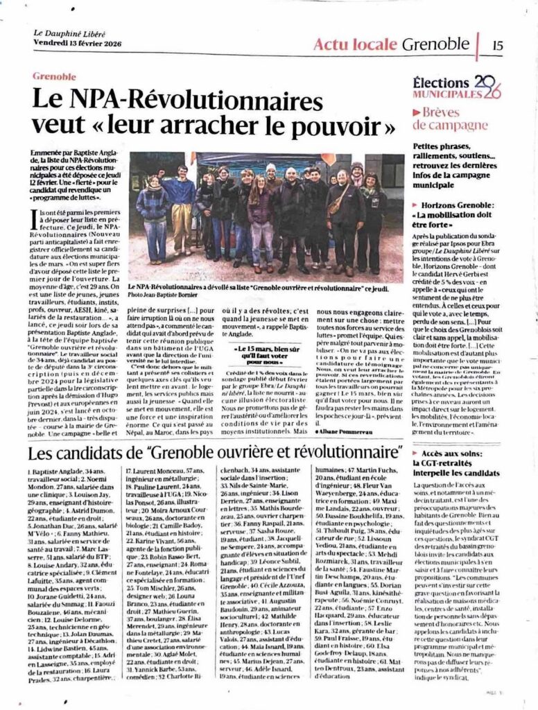 Dans Le Dauphine Libéré — Municipales 2026. À Grenoble, le NPA-Révolutionnaires veut « leur arracher le pouvoir »