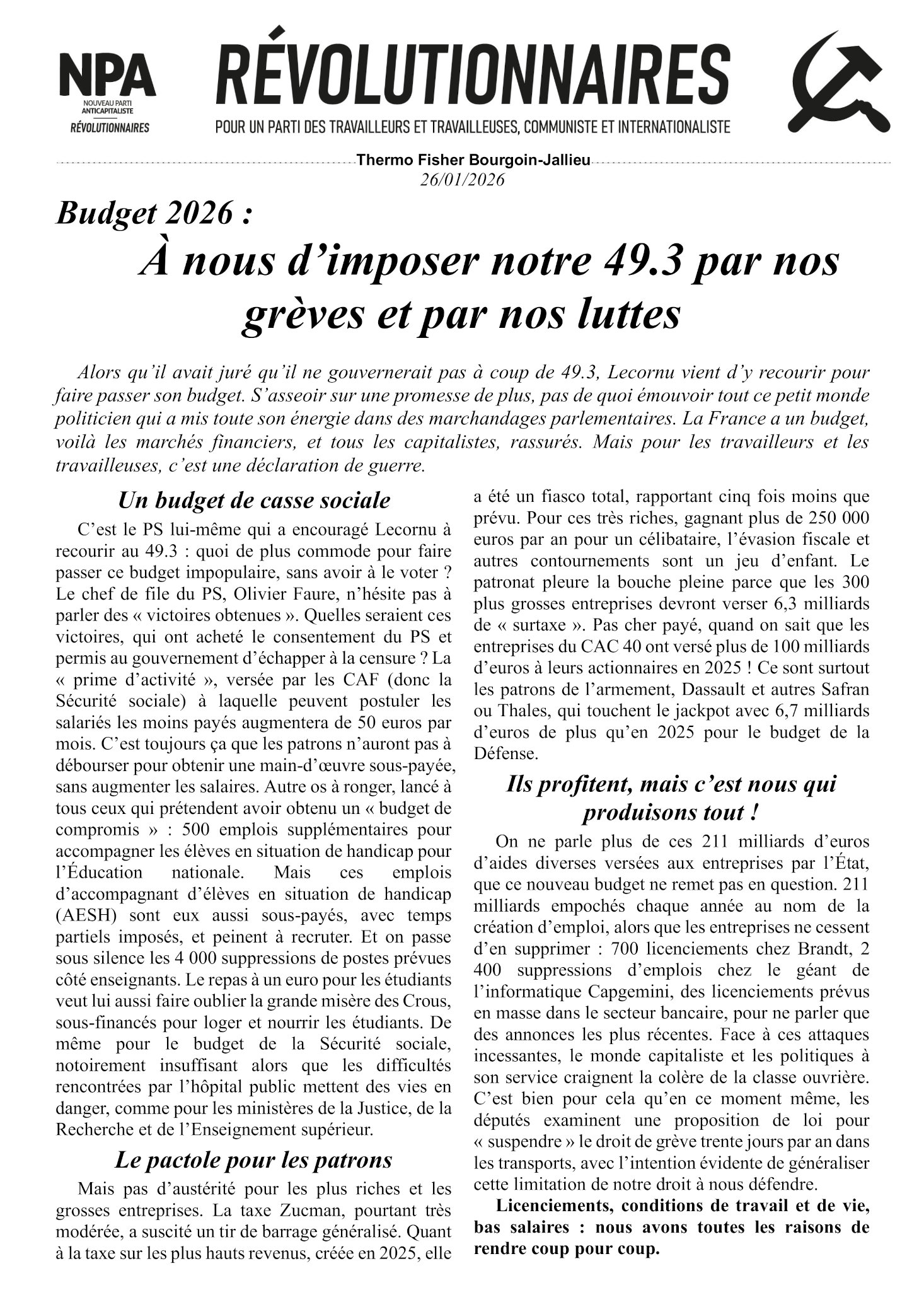 Le journal du NPA Révolutionnaires