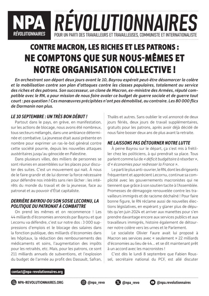 En orchestrant son départ deux jours avant le 10, Bayrou espérait peut-être désamorcer la colère et la mobilisation contre son plan d’attaques contre les classes populaires, totalement au service des riches et des patrons. Son successeur, un clone de Macron, ex-ministre des Armées, réputé compatible avec le RN, a pour mission de nous faire avaler ce budget de guerre sociale et de guerre tout court : pas question ! Ces manœuvres précipitées n’ont pas démobilisé, au contraire. Les 80 000 flics de Darmanin non plus.