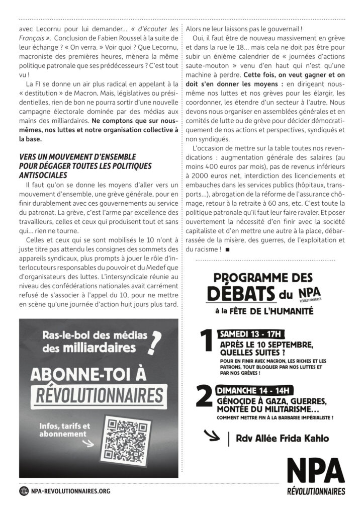 On prend les mêmes et on recommence ! Les 44 milliards d’économies annoncés par Bayrou et que Lecornu va défendre, c’est sur notre dos : 3 000 suppressions d’emplois et le blocage des salaires dans la fonction publique, des milliards d’économies dans les hôpitaux, la réduction des remboursements des médicaments et soins, l’augmentation des impôts pour les retraités, etc. Mais, pour les patrons, ce sont 211 milliards annuels de subventions, et l’explosion du budget de l’armée au profit des Dassault, Safran, Thalès et autres. Sans oublier le vol annoncé de deux jours fériés, deux jours de travail supplémentaires, gratuits pour les patrons, après avoir déjà décidé de nous faire bosser deux ans de plus avant la retraite.