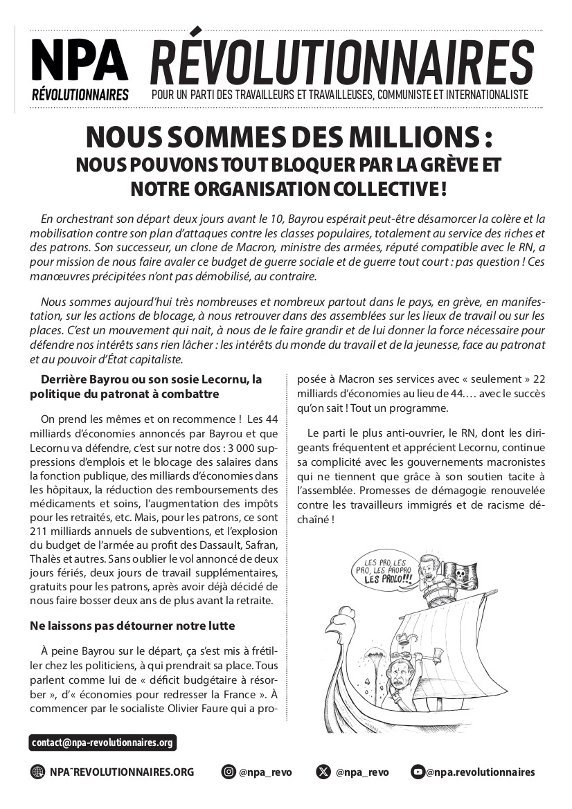En orchestrant son départ deux jours avant le 10, Bayrou espérait peut-être désamorcer la colère et la mobilisation contre son plan d’attaques contre les classes populaires, totalement au service des riches et des patrons. Son successeur, un clone de Macron, ministre des armées, réputé compatible avec le RN, a pour mission de nous faire avaler ce budget de guerre sociale et de guerre tout court : pas question !