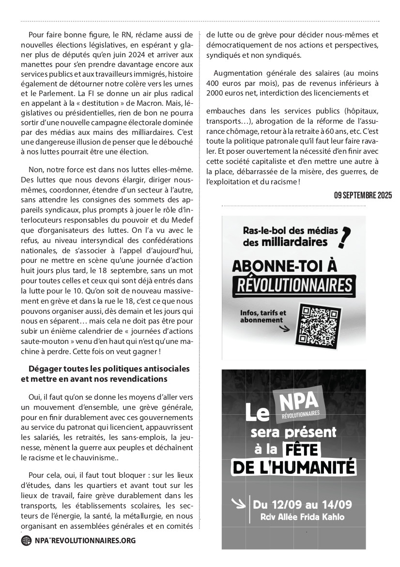 Non, notre force est dans nos luttes elles-mêmes. Des luttes que nous devons élargir, diriger nous-mêmes, coordonner, étendre d’un secteur à l’autre, sans attendre les consignes des sommets des appareils syndicaux, plus prompts à jouer le rôle d’interlocuteurs responsables du pouvoir et du Medef que d’organisateurs des luttes. On l’a vu avec le refus, au niveau intersyndical des confédérations nationales, de s’associer à l’appel d’aujourd’hui, pour ne mettre en scène qu’une journée d’action huit jours plus tard, le 18 septembre, sans un mot pour toutes celles et ceux qui sont déjà entrés dans la lutte pour le 10. Qu’on soit de nouveau massivement en grève et dans la rue le 18, c’est ce que nous pouvons organiser aussi, dès demain et les jours qui nous en séparent… mais cela ne doit pas être pour subir un énième calendrier de « journées d’actions saute-mouton » venu d’en haut qui n’est qu’une machine à perdre. Cette fois on veut gagner !