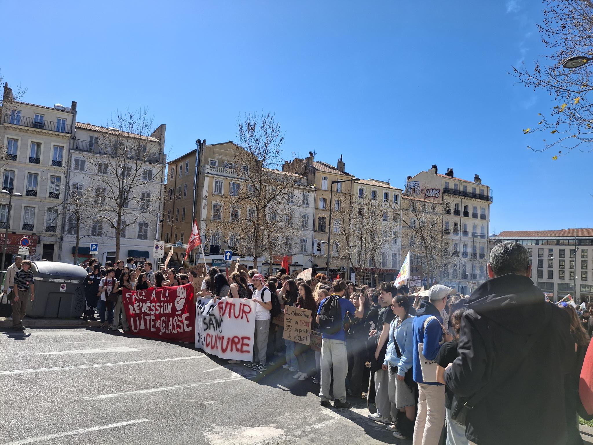 Les lycées mobilisés à Marseille comptent bien continuer à se faire entendre, et à décider tous et toutes ensemble du rythme de leur mobilisation. Pour que la colère fasse contagion, dans les Bouches-du-Rhône et, espérons-le, au-delà, dans l’assemblée générale après la manif du 17, on discute des modalités pour continuer à s’adresser à d’autres, de tournées de bahuts en commun entre profs, personnel non enseignant et élèves, et de la volonté de construire une journée nationale de mobilisation pour le 26 mars au plus tard.